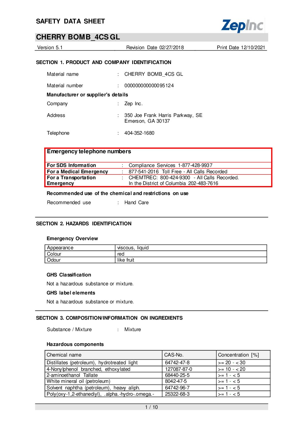 Cherry Bomb Hand Cleaner, Cherry Scent, 1 gal Bottle, 4/Carton