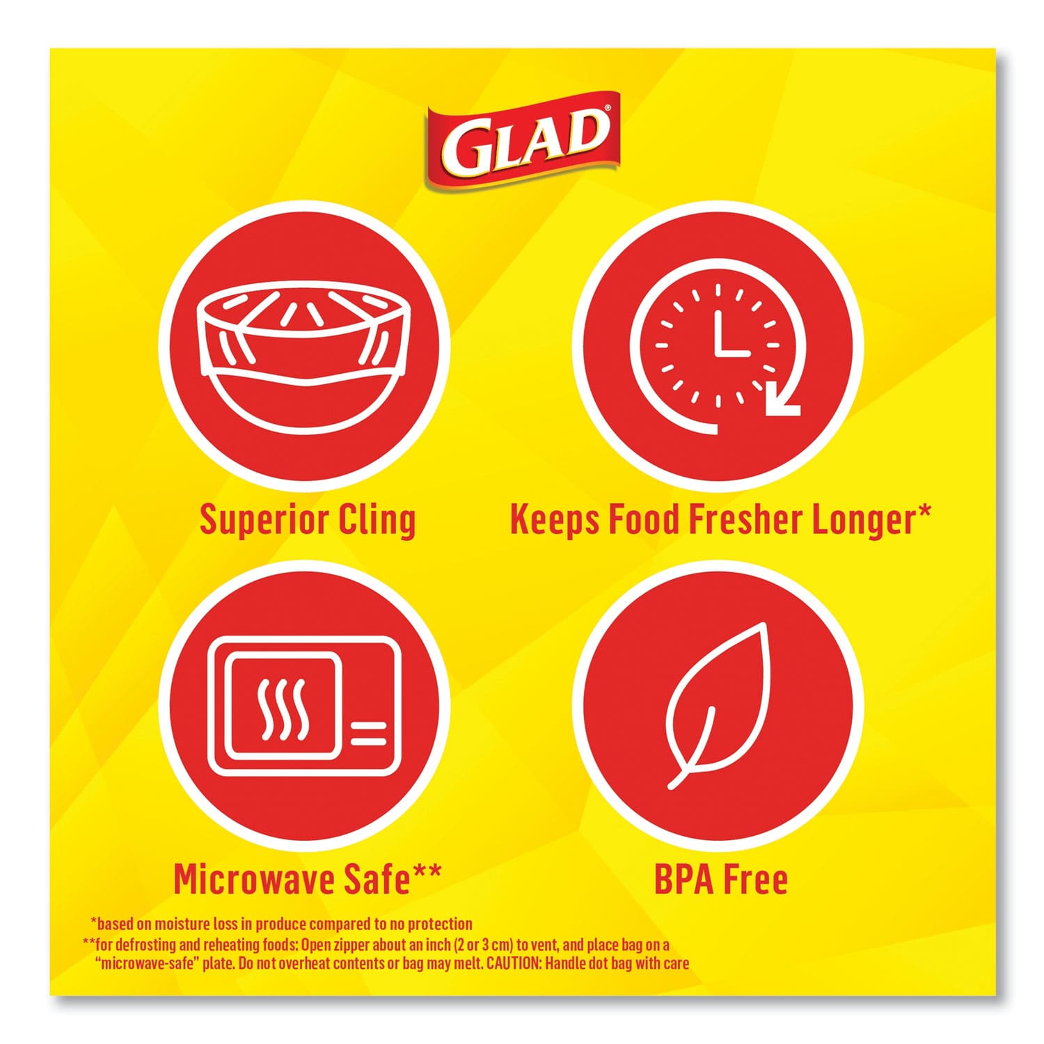 Glad ClingWrap extends your food’s freshness by keeping air out with a superior seal cling. With 3X the freshness based on moisture loss in produce versus no protection, keep your foods fresher longer. Its easy to use roll makes protecting your favorite foods fast and simple. This food wrap is easy to handle and grips to a variety of surfaces, such as glass and metal, making it useful for portioning, preparing, steaming, and protecting. ClingWrap can be used outside of the kitchen too. It is great to use for preventing leaks in toiletries when traveling, wrapping wet paint brushes to use later, or keeping items in drawers when moving. Glad ClingWrap contains no plasticizer, and is BPA free and microwave safe. Ideal for use in restaurants, cafeterias and other food service facilities. Glad protects and seals with ease.