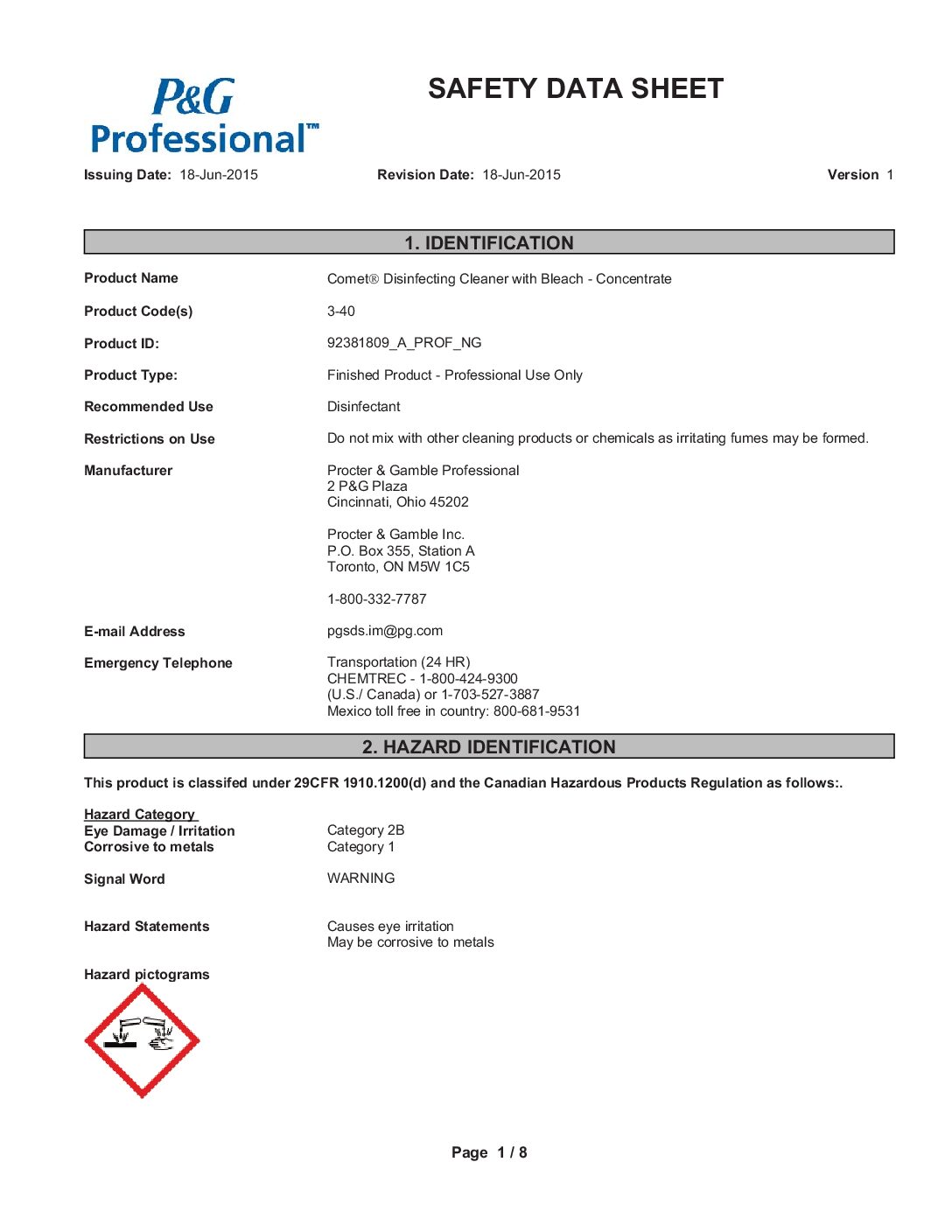 Comet Disinfecting Cleaner With Bleach is a two-in-one all purpose cleaner formula that combines the cleaning power of heavy-duty detergents with the stain-removal power of bleach. A hospital-use disinfectant when used per label instructions, It is effective as a disinfectant in 60 seconds against Hepatitis A and C, Norovirus, and 39 other microorganisms (See EPA master label for full list of organisms and contact times. Not yet approved in CA). Comet Disinfecting Cleaner With Bleach contains no abrasives and uses remarkable cleaning technologies that may be used to clean customer and employee restrooms, tracked-in dirt and scuffmarks, kitchen-area stains, plastic trash containers, greasy equipment containers and other surfaces.