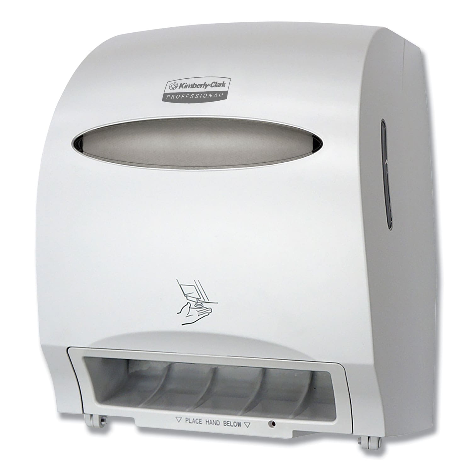 Reduce the hassle of restroom maintenance with the high-capacity Kimberly-Clark Professional Automatic Towel Dispenser. This touchless, wall mount roll towel dispenser needs infrequent refilling and provides consistent, reliable performance. Your washroom guests will enjoy the benefits of hygienic, touch free dispensing – they’ll only touch the towel they’re using. This high capacity towel dispenser is made of high impact smoke colored plastic. The unit dispenses a nominal 11″ of towel when activated by placing hand under the unit. A second sheet will dispense at 10% reduced length when activated within a few seconds. Features include a quiet dispensing system, quick load capability and choice of key-activated spring lock or push button operation.