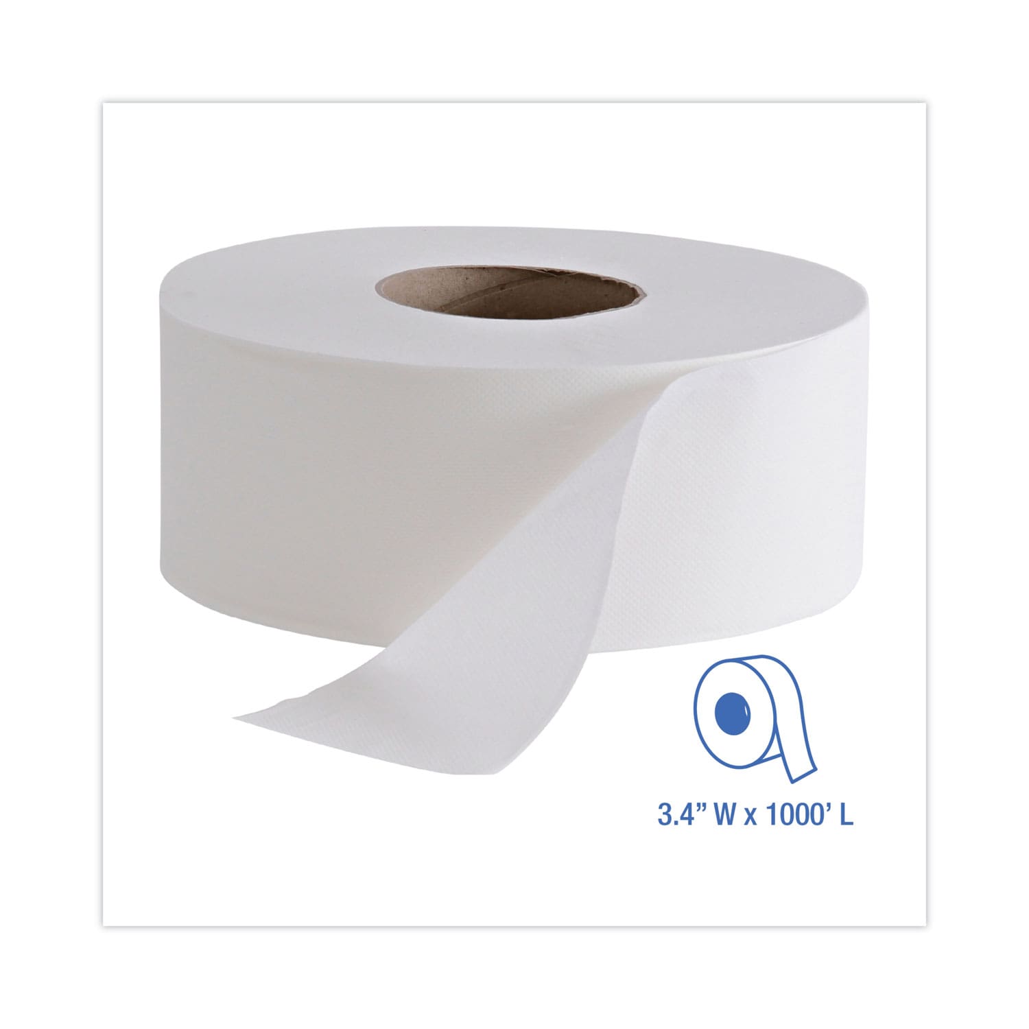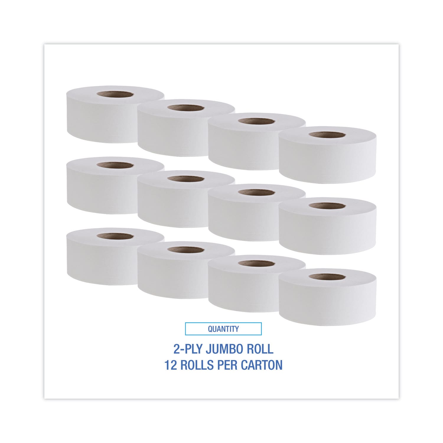 Soft, white toilet tissue is a perfect choice for high-traffic restrooms where there isn’t always an attendant on-duty to replace the roll. Economical value size. The jumbo size tissue rolls ensure more feet per roll, resulting in fewer roll changes. Laminated for excellent strength and ply bonding. Safe for septic and sewer systems. The rolls are compatible with dispensers, which are sold separately.