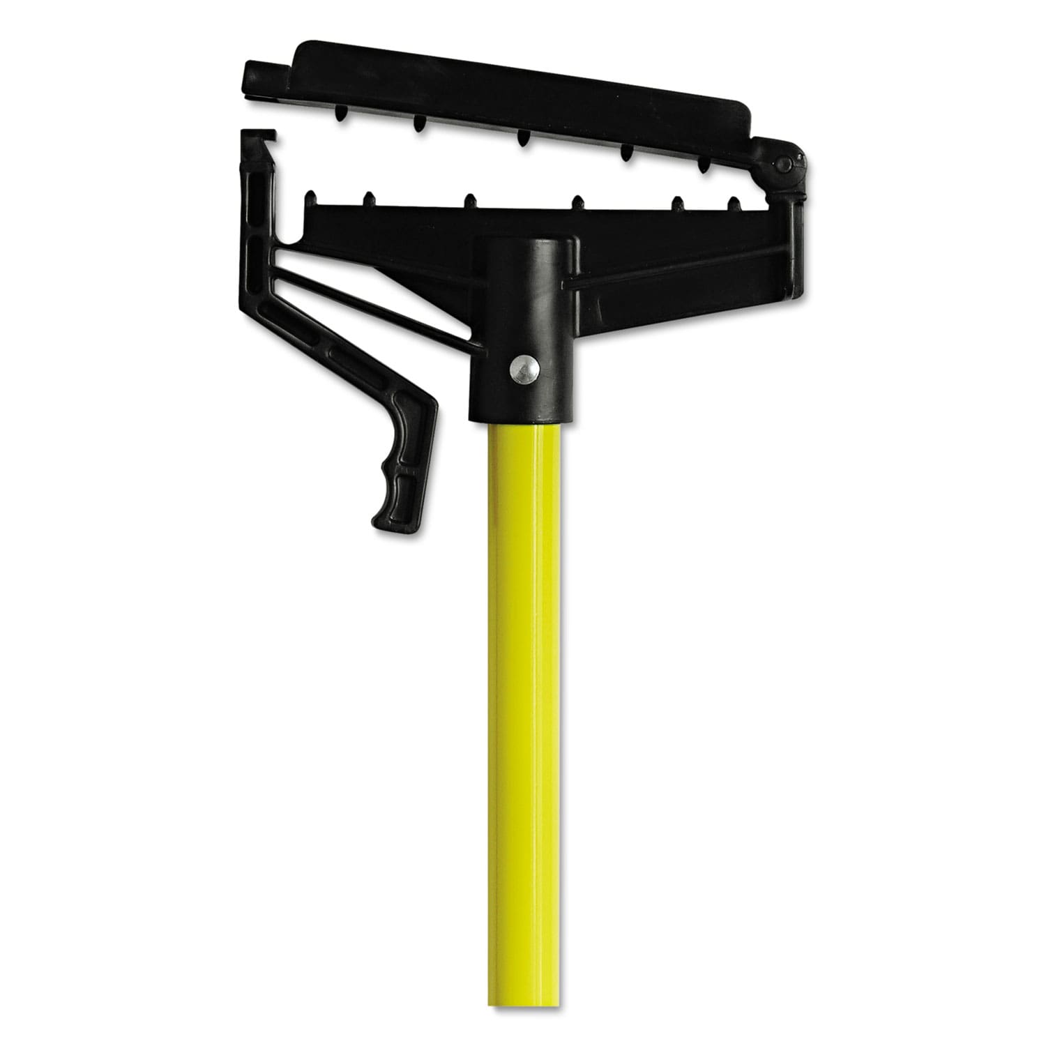 Make everyday cleaning quick and easy, with an extremely durable, yet lightweight, quick-change mop handle. Heavy duty sanitary black plastic frame with easy trigger release allows you to quickly discard a soiled mop without touching it. Fiberglass handle is easy to sanitize.