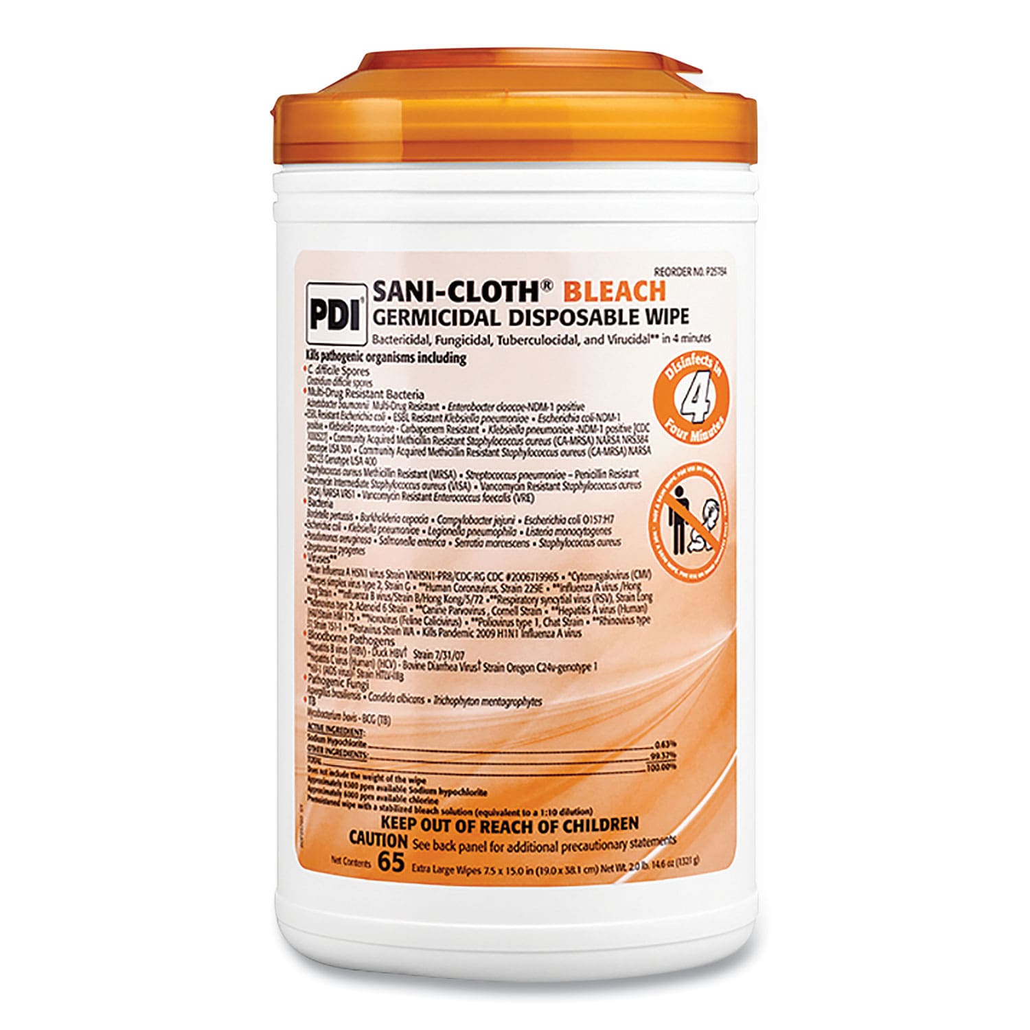 Sani-Cloth Bleach Germicidal Disposable Wipes, 1-Ply, 7.5 x 15, Unscented, White, 65/Pack