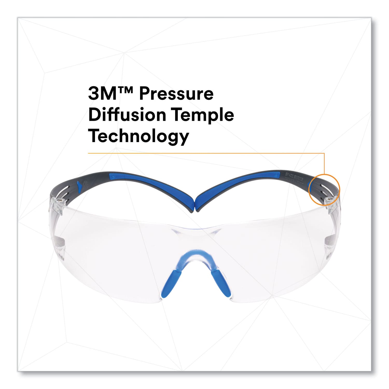3M® Pressure Diffusion Technology allows temples to naturally adjust to individual head sizes, eliminating the need to stock multiple frame sizes at worksites. Secure, snug fit keeps eyewear in place without slippage even when the wearer is in motion. Anti-fog coating helps keep lenses free of moisture in hot and humid conditions. Polycarbonate lenses absorb 99.9% UVA and UVB up to 380 nm.