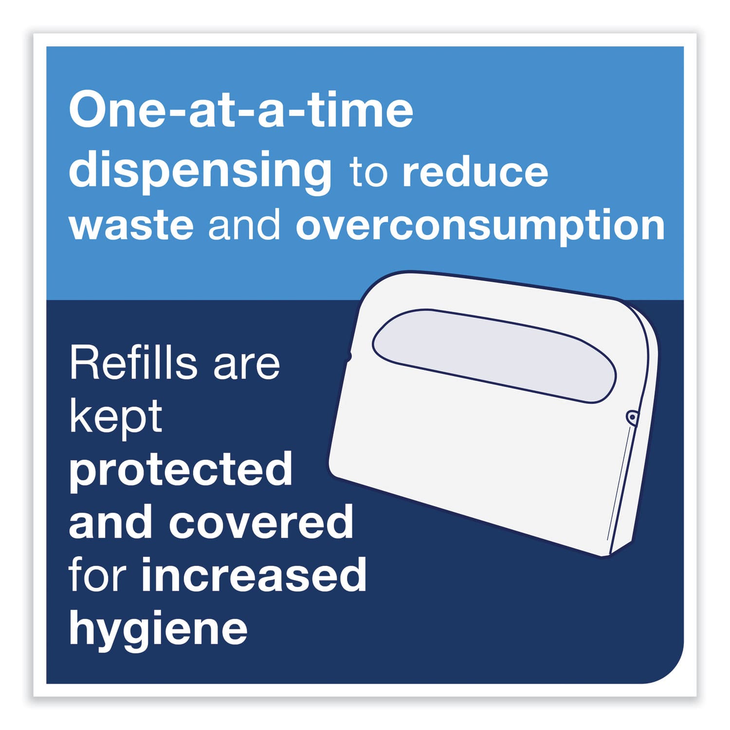 The Tork Toilet Seat Cover Dispenser improves hygiene with refills that stay covered and protected until they’re dispensed. Intuitive dispensing makes the refills easy to access for patrons. Plus, one-at-a-time dispensing reduces waste and over-consumption. This dispenser holds an entire pack of refills, allowing you to quickly and easily refill it.