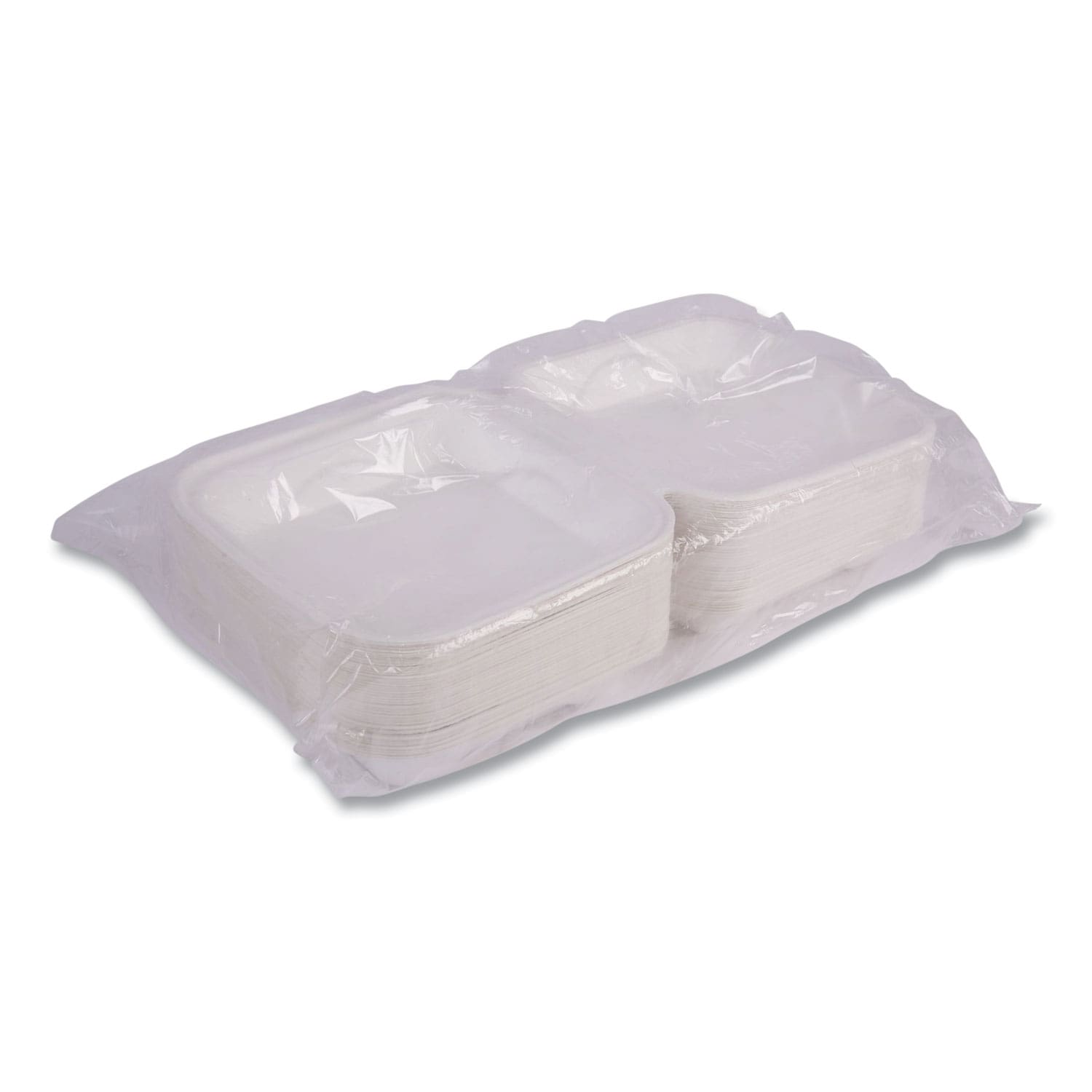Eco-Products award-winning new line, Vanguard, is a collection of groundbreaking molded fiber clamshell containers. Vanguard products use FDA approved proprietary alternative compounds to achieve grease-resistance performance, without relying on conventional PFAS (Per- and polyfluoroalkyl substances). Made from reclaimed and rapidly renewable sugarcane fibers, this product meets BPI requirements for compostability certification. This recycled, disposable clamshell container is both hot and cold food friendly and microwave safe.